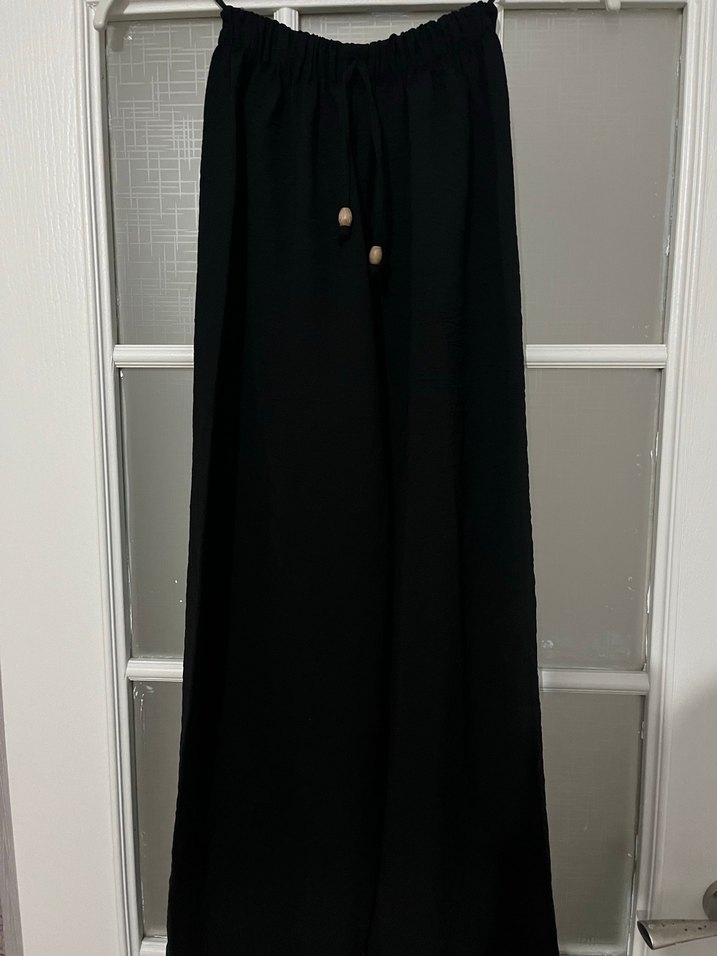 Düğmeli, siyah, uzun ve bol kesim kadın etek, ipeksi dokusu ve sade tasarımıyla günlük kullanıma uygun.