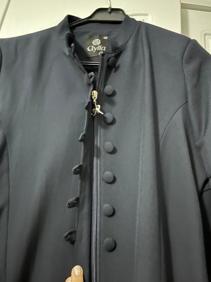 Düğmeli, kesik yakalı, uzun kollu siyah kadın ferace Sentetik kumaştan, parlak yüzeyli, günlük kullanımı için uygun klasik tarzda.