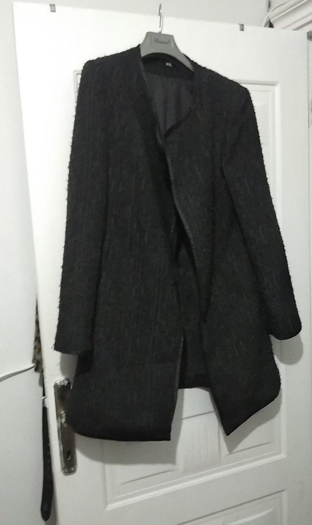 Siyah renkli, düğmeli uzun kadın kaban. Notch yaka ve uzun kollu, düz ve düzenli kesim. Ofis için uygun, sentetik kumaştan üretilmiştir.