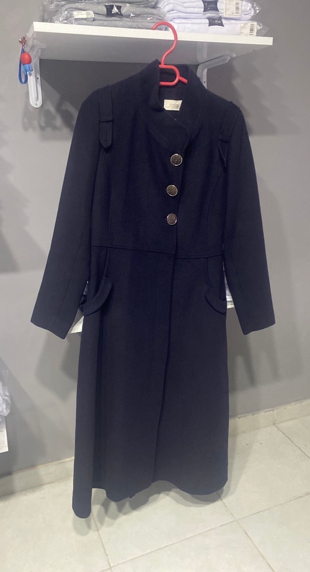 Düğmeli, siyah uzun kadın kabanı, yumuşak ve sıcak kumaştan, normal kesim ve uzun kolludur. Ofis için klasik şıklık sunar.
