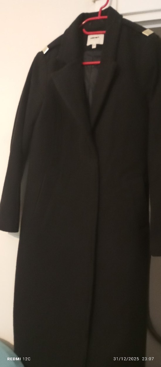 Düğmeli, uzun siyah kadın kaban, kesik yaka ve uzun kolludur. Yumuşak ve sıcak kumaştan üretilmiş, ofis için uygundur.