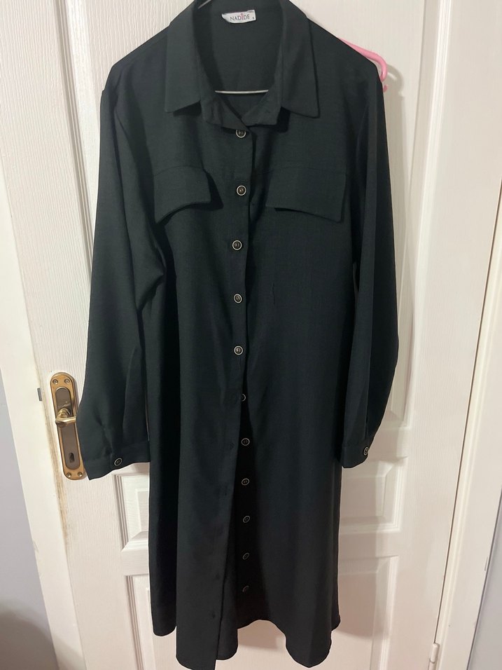 Düğmeli, uzun siyah kadın tunik, bol kesim ve uzun kolludur. Çentikli yakası ve düğmeli önü ile ofis ve günlük kullanıma uygundur.