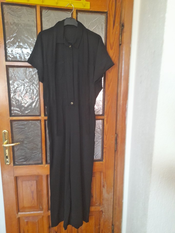 Kadınlar için düğmeli, kısa kollu, keten kumaştan yapılmış uzun siyah tulum. Notlu yaka ve regular kesimiyle minimalist goth tarzında, ofis için uygundur.