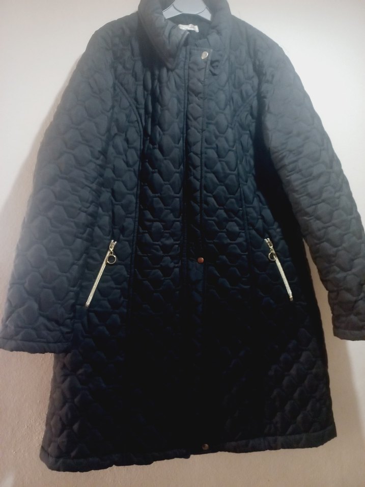Düğmeli, çıtçıtlı, uzun siyah kadın kışlık mont. Sentetik kumaştan, regular fit ve çıtçıtlı kollu. Fermuarlı cepleriyle günlük sokak stili için uygun. ❄️