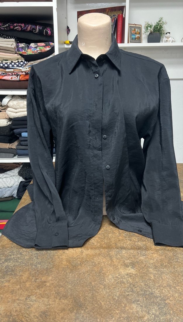 Düğmeli, uzun kollu ve kesik yakalı siyah kadın gömleği. İpeksi kumaştan, rahat kesim ve uzun boyda, ofis için uygundur.