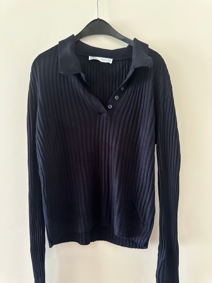 Düğmeli önü ve yakalı, uzun kollu siyah kadın kazak. Suni kumaştan, rahat ve bol kesim, günlük sokak stiline uygun.