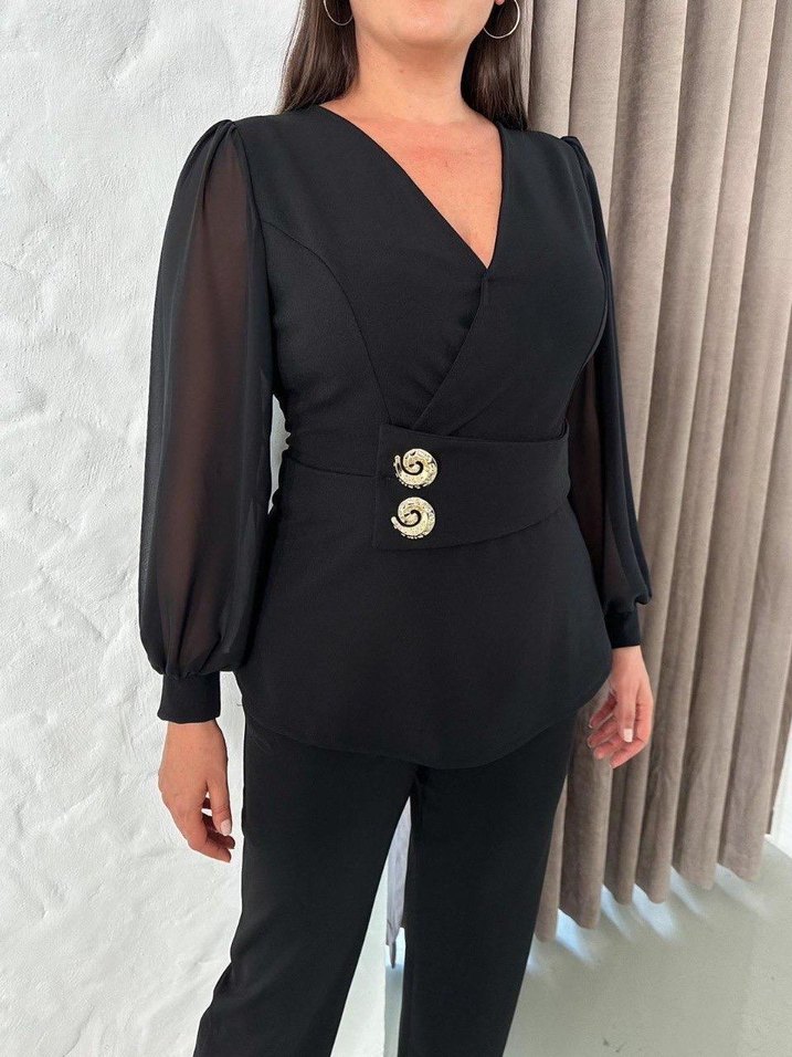 Düğmeli, V yaka, uzun kollu siyah kadın takımı. Şeffaf kollar ve baskılı desenle klasik şıklık sunar.