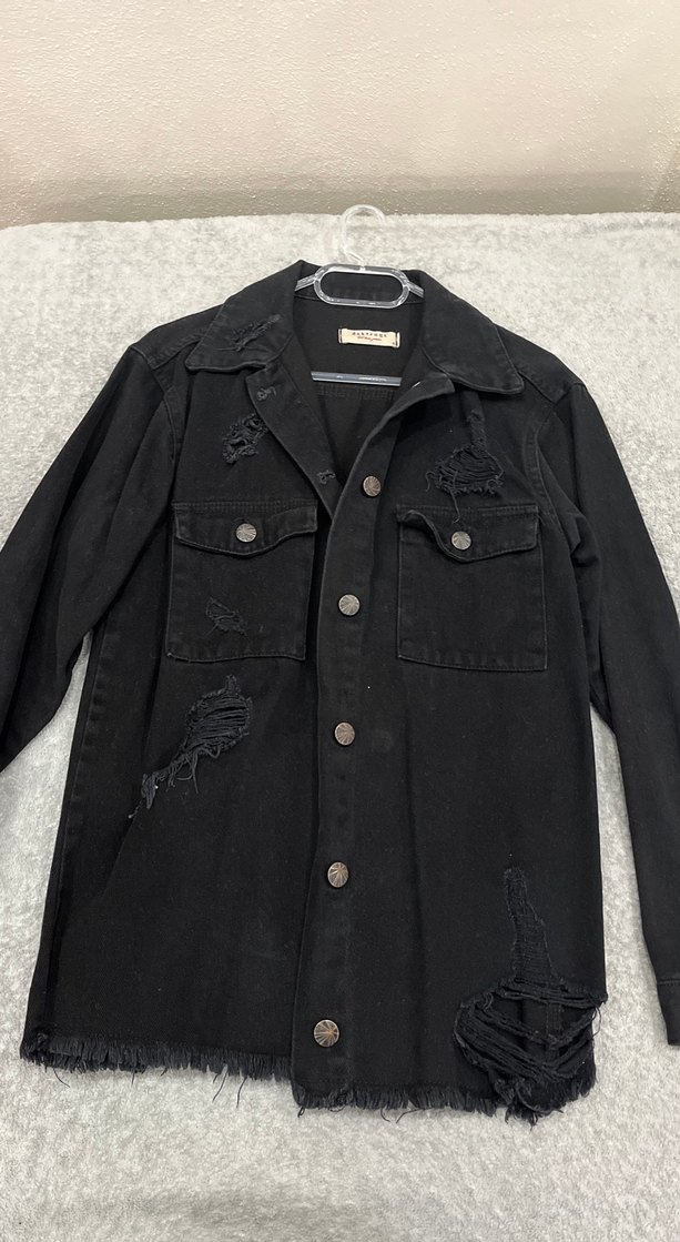Siyah uzun kesim, düğmeli, yaka detaylı ve bol kesim kot ceket. Sokak stiline uygun yıpranmış detaylar bulunur.