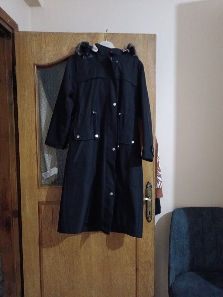 42 beden Siyah uzun kadın mont, düğmeli, kesik yaka ve uzun kolludur. Rahat kesim ve sıcak tutan yumuşak kumaştan yapılmıştır. boyu 102 cm az giynildi yeni gibi temiz