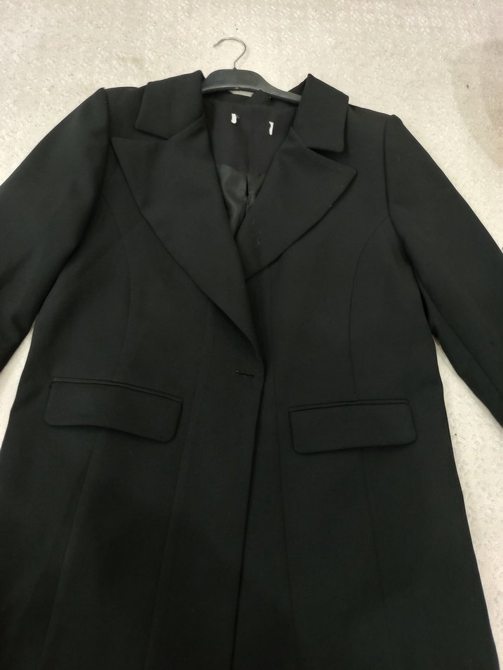 Düğmeli, siyah uzun kadın kabanı, notched lapel yaka ve düz desensiz. Sentetik kumaştan, ofis ve goth tarzına uygun.