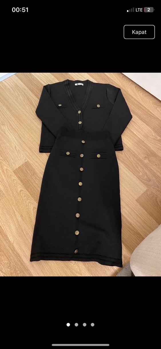 Düğmeli, yakalı ve uzun kollu siyah kadın takım elbisesi, düz kesim etek ile tamamlanmıştır. Trenyoldan 1200 e aldım zararına bıraktım