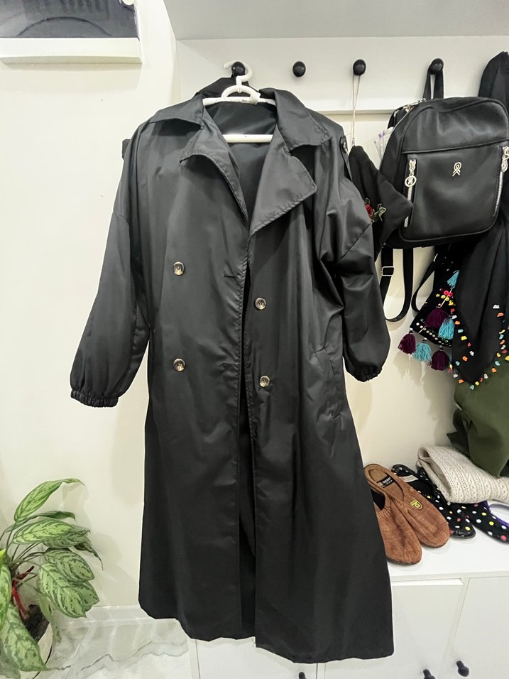 Düğmeli, uzun kollu, siyah kadın trençkot. Sentetik kumaştan, bol kesim ve kesik yaka ile günlük kullanım için uygundur.