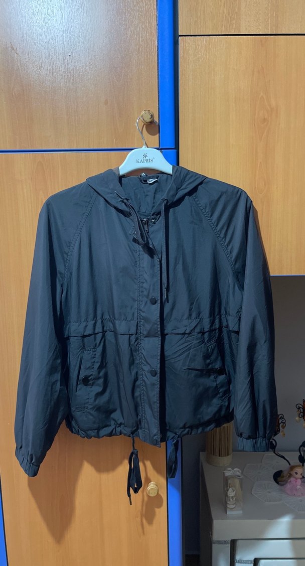 Düğmeli ve kapüşonlu siyah yağmurluk ceket, uzun kollu ve notched yakalı, rahat kesim, dış mekan kullanımı için uygun