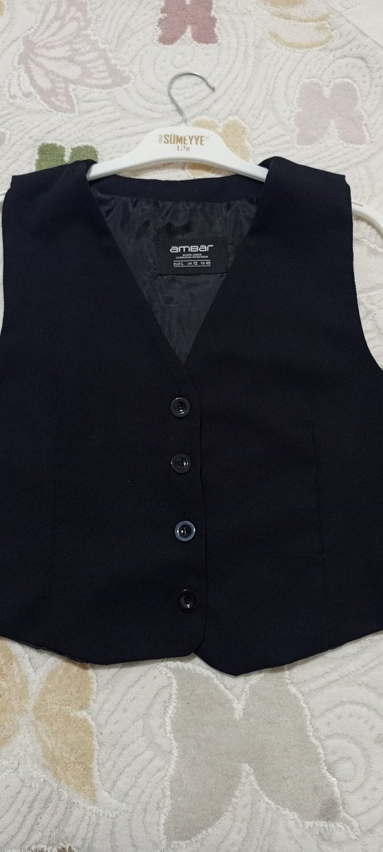Düğmeli, yakalı ve kolsuz siyah kadın yeleği. Sentetik kumaştan, normal kesim ve midi boyda, iş ortamları için uygundur.