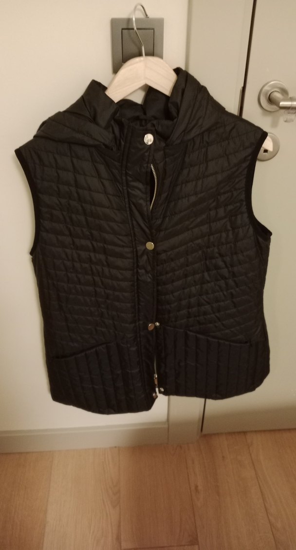 Düğmeli, yüksek yakalı, siyah renkli, kapitone desenli, normal boyda, vücuda oturan kadın yeleği.