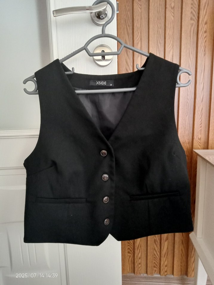 Düğmeli, siyah, kolsuz yelek. Notlu yaka ve midi boyda, sentetik kumaştan, düzenli kesim. Ofis için goth tarzında uygun.
