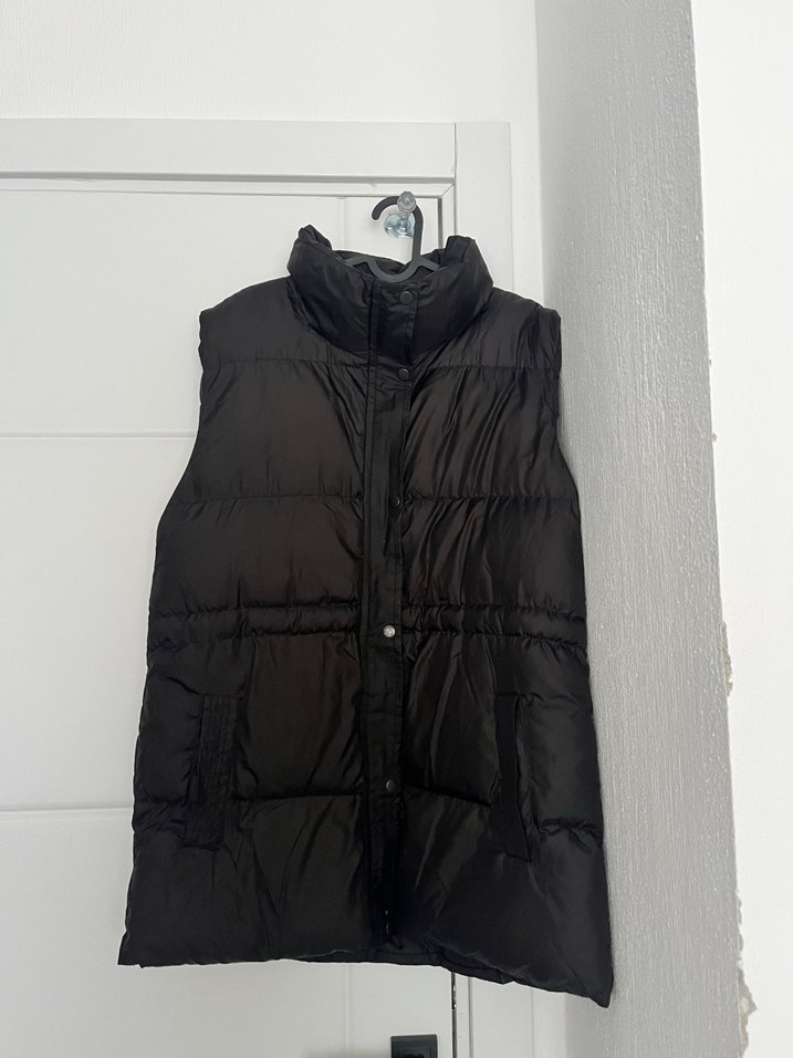Düğmeli, yüksek yakalı, siyah, kolsuz ve fitted kesim yelek. Yumuşak ve sıcak kumaştan, midi boy ve ceplidir.