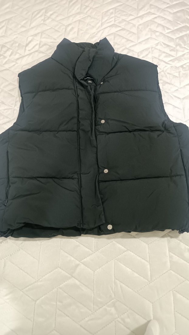 Düğmeli, yüksek yakalı siyah kadın yeleği. Yumuşak ve sıcak kumaştan, normal uzunlukta ve dar kesim, günlük kullanıma uygun.