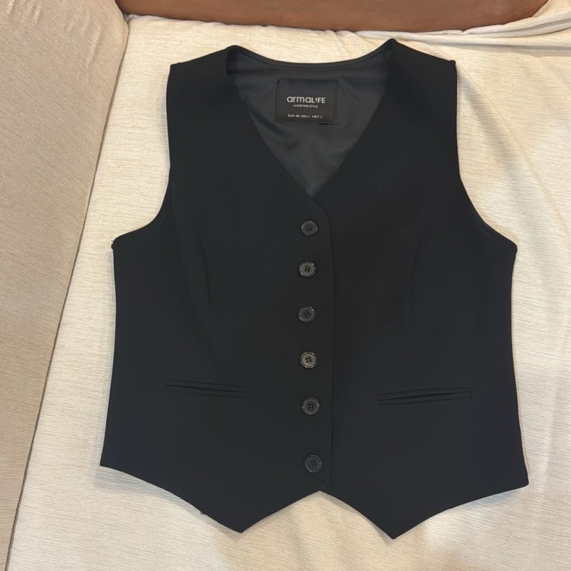 Düğmeli, yakalı, siyah kadın yelek. Düz kesim ve sentetik kumaştan, ofis için uygun klasik gotik tarzında.