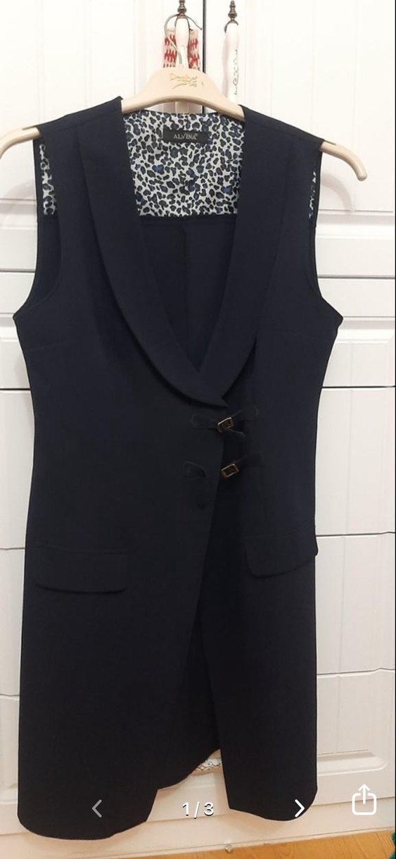 Düğmeli, uzun laci kadın yeleği. Kolsuz ve ipeksi dokulu, ofis için uygun klasik şıklık sunar.