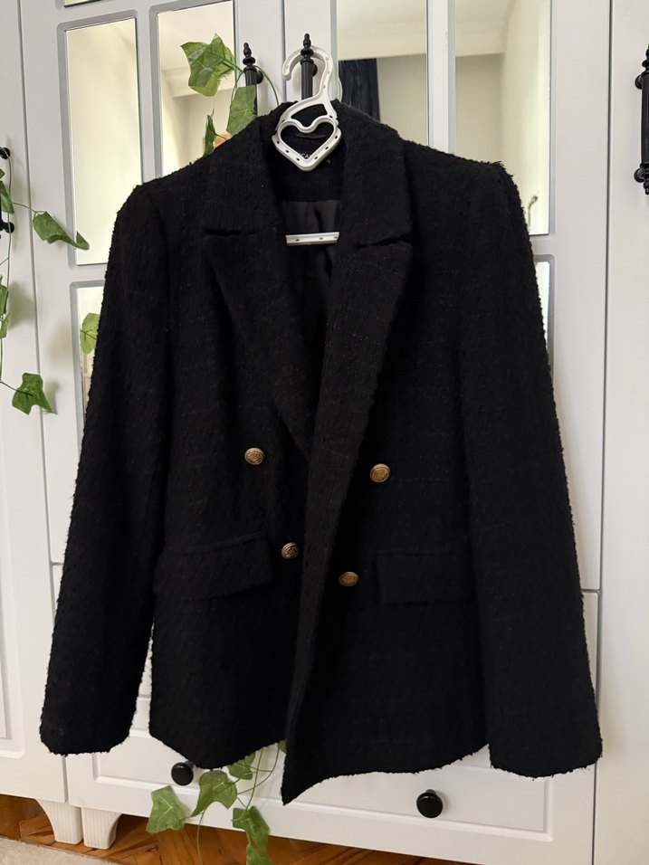 Düğmeli, yün kumaştan siyah blazer ceket. Notlu yaka, uzun kollu ve normal boyda, klasik şıklık için ideal. ✨