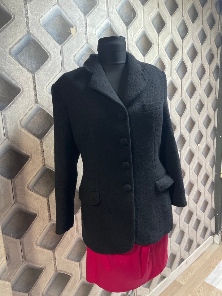 Siyah yün kumaştan yapılmış, düğmeli ve kesik yakalı kadın blazer ceket. Normal kesim, uzun kollu ve midi boyda, ofis için uygun goth tarzı.