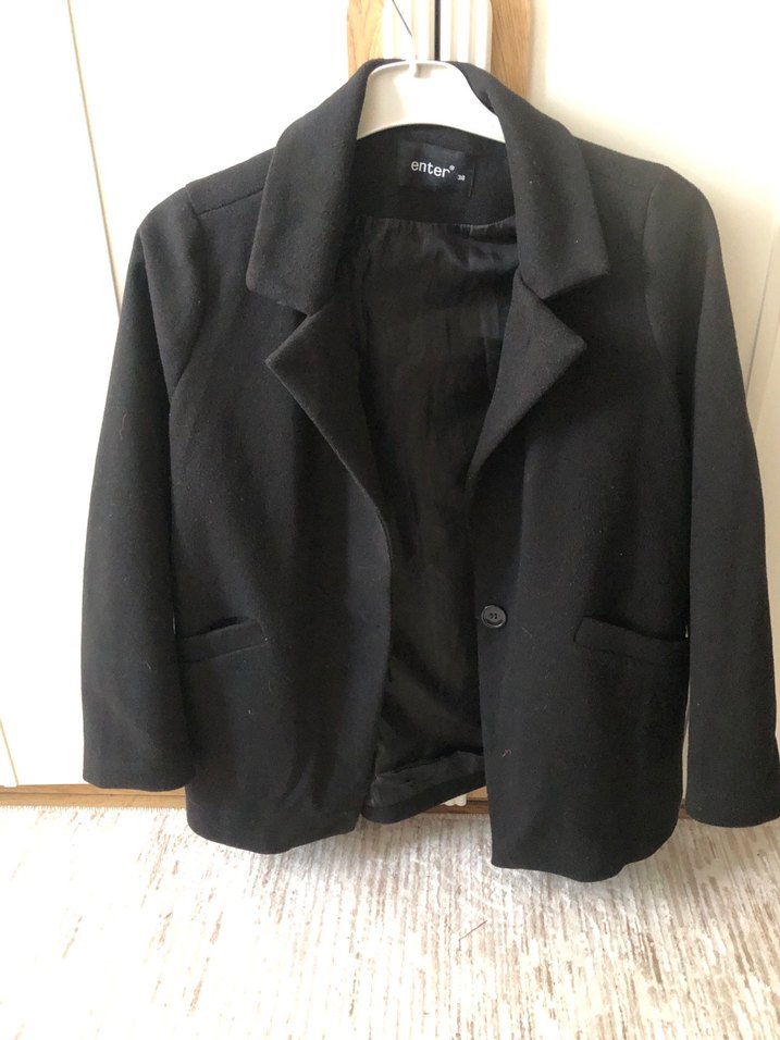 Düğmeli, yün kumaştan yapılmış siyah kaban .Normal midi boyda, uzun kollu ve klasik yaka detayına sahip, ofis kullanımı için uygun.