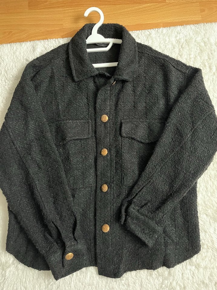 Siyah renkli, düğmeli, yün kumaştan yapılmış kadın ceketi. Notlu yaka ve uzun kolludur, günlük sokak stili için uygundur.