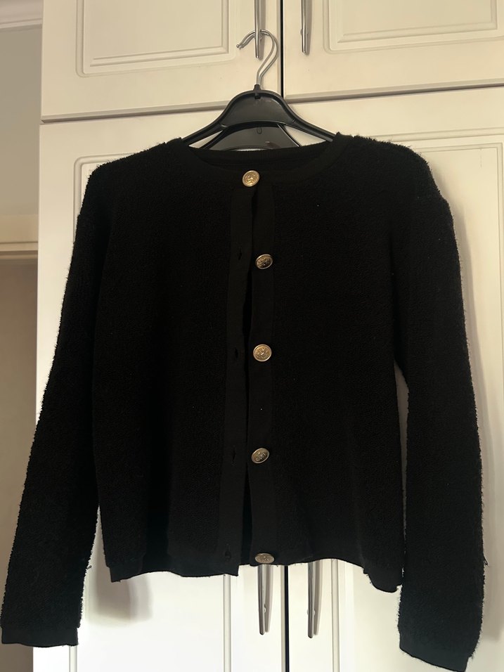 Bu siyah yün hırka, düğmeli ön kısmı, uzun kolları ve bol kesimi ile dikkat çeker. Notlu yaka ve midi boydadır, günlük kullanıma uygundur ve gotik ile Paris tarzını yansıtır.