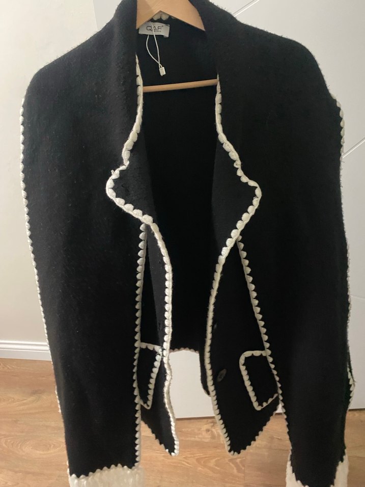 Düğmeli ve beyaz işlemeli detaylara sahip, uzun ve siyah yün kumaştan, kesimi vücuda oturan, yakası kesik yaka kadın kaban.