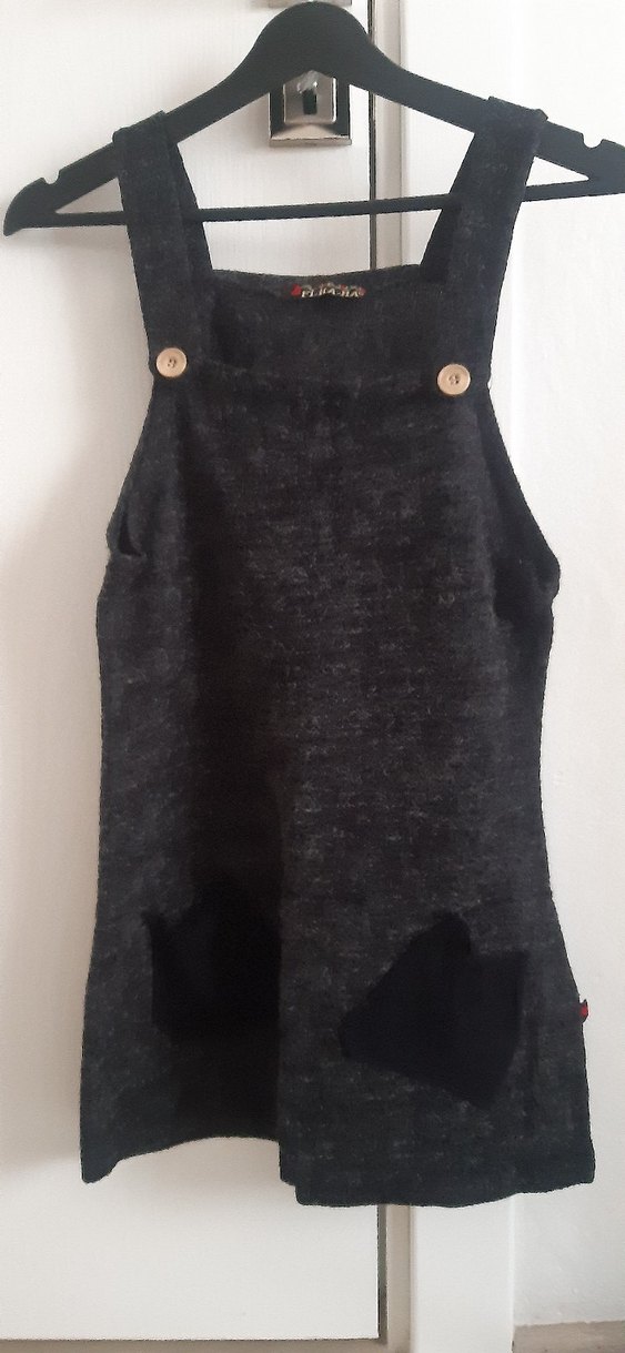 Siyah yün triko elbise, düğmeli, kolsuz ve bol kesimdir. desensiz ve günlük kullanıma uygundur.