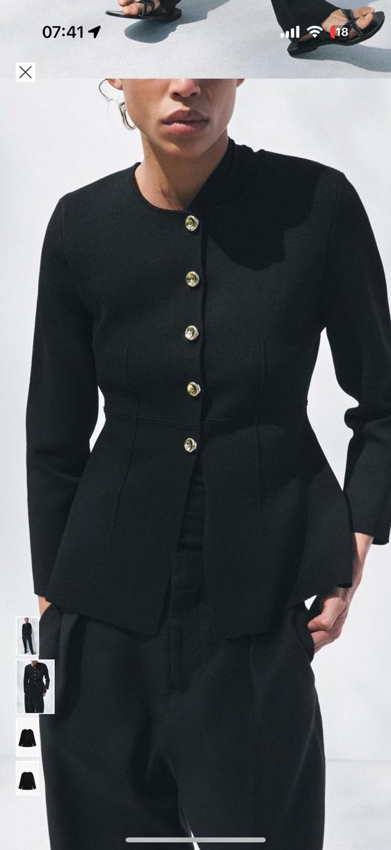 Siyah, düğmeli, uzun kollu kadın ceket. İpeksi kumaştan, midi boy ve klasik ofis şıklığı için uygun.