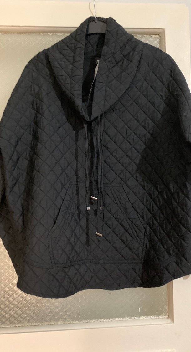 Siyah keten kumaştan, kapüşonlu, uzun kollu ve düğmeli, rahat kesim kadın ceket. Kapitone dokusu ve midi boy uzunluğu ile günlük kullanıma uygun.