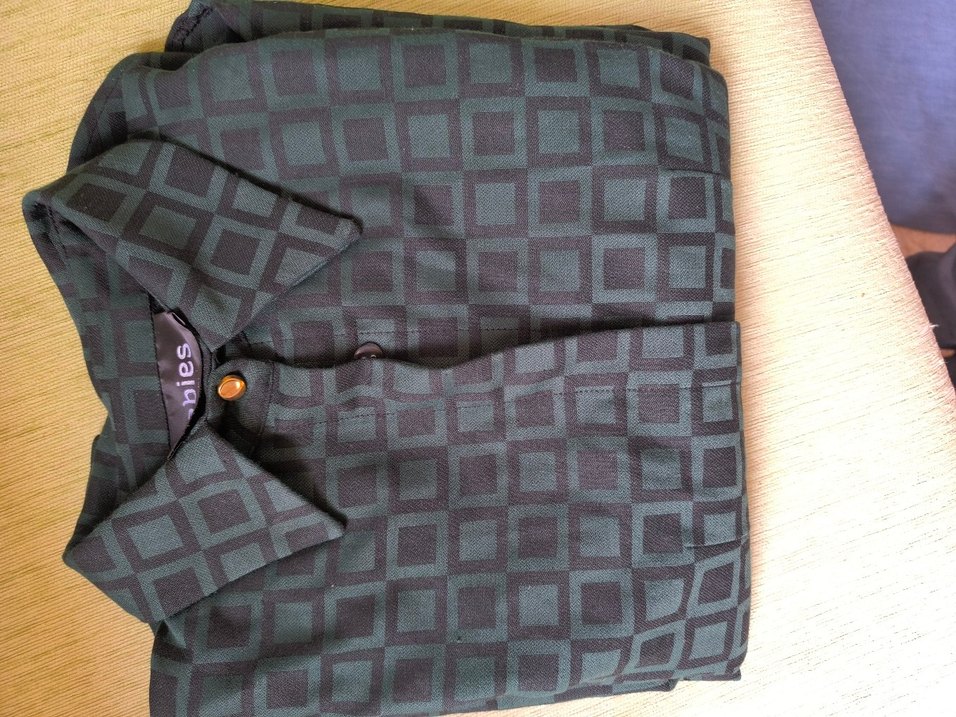 Düğmeli, kesik yaka, uzun kollu siyahkare desenli erkek gömleği. Sentetik kumaştan, normal kesim ve midi boyda, ofis ve sokak stiline uygun.