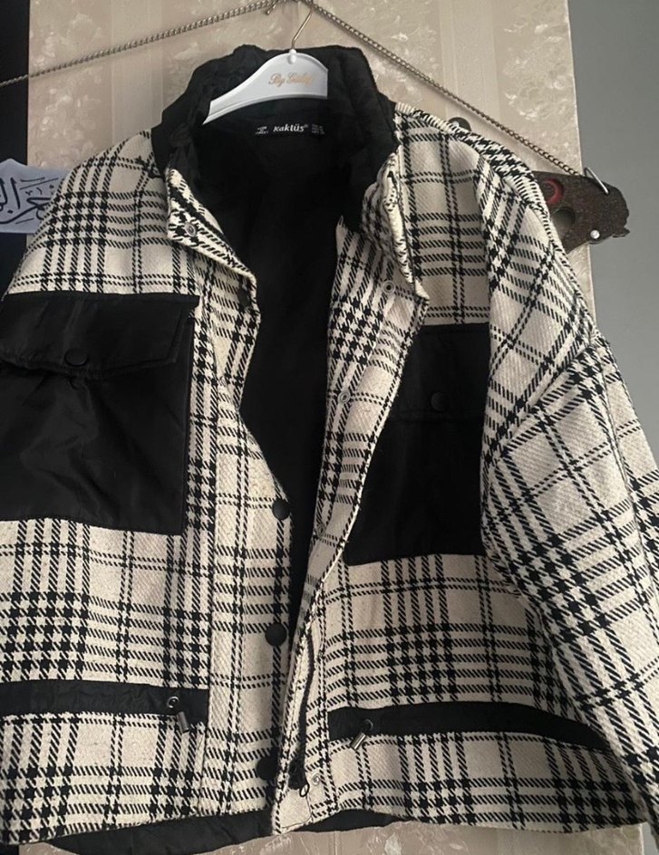 Kadın düğmeli, ekose desenli, bol kesim ve kısa boyda. Uzun kollu, çentikli yaka ve sentetik kumaştan siyah tonlarda. Günlük ve sokak stiline uygun. Hiç bir defosu tiftiği yok max 3 defa giyildi oversize.
