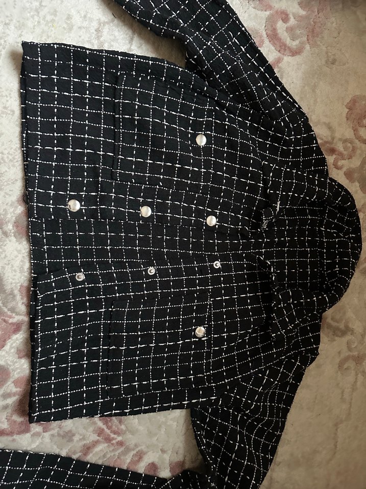 Düğmeli, siyah kareli bu ceket, kesik yaka ve uzun kolludur. Normal kesim ve günlük kullanım için uygundur.