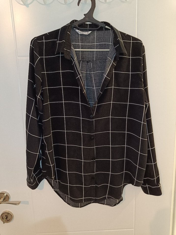 Düğmeli, uzun kollu ve yakalı kadın gömlek. Siyah kareli deseniyle ofis ve günlük kullanıma uygun, sentetik kumaştan rahat bir parça.