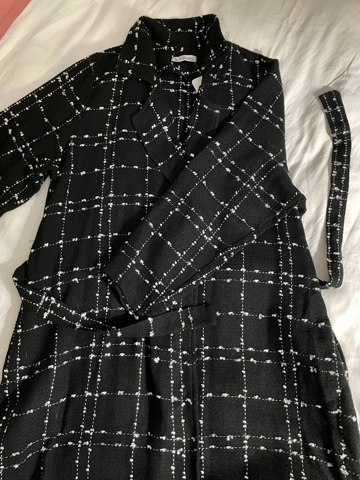 Düğmeli, kareli desenli, siyah uzun kadın kaban. Yaka tipi notched lapel, strappy kollu, regular fit ve sentetik kumaştan üretilmiştir.