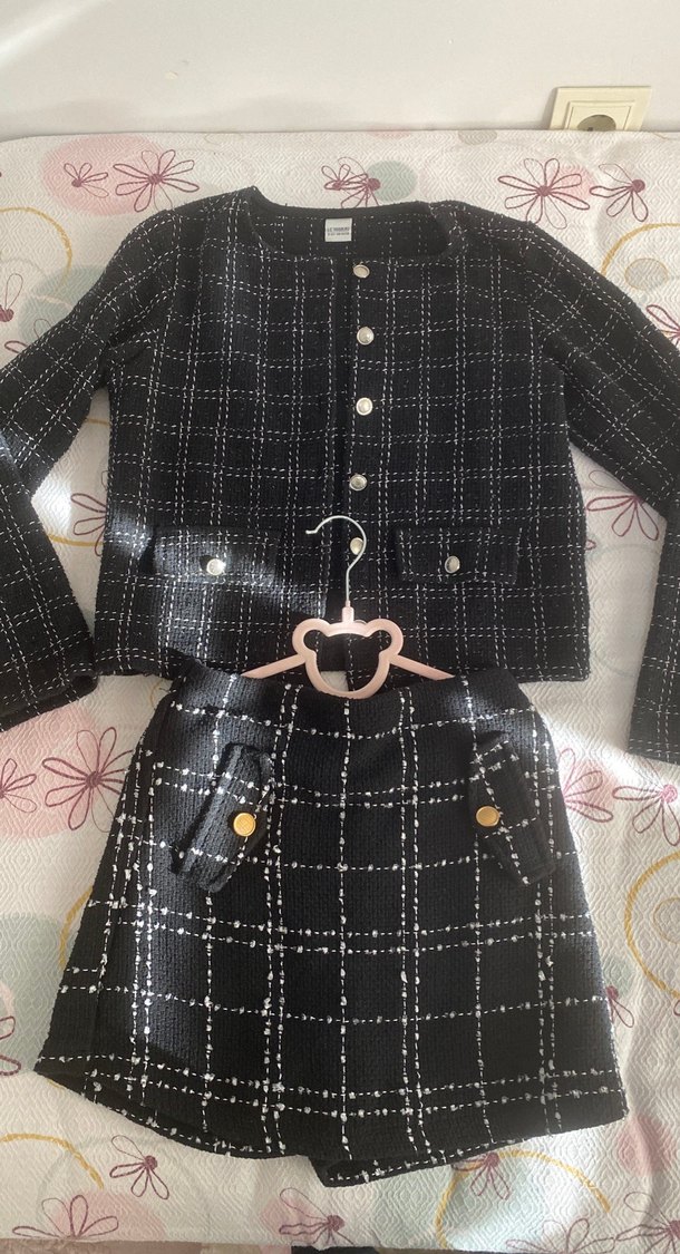 Düğmeli, uzun kollu, siyah kareli kısa kadın takımı. Notch yaka ve sentetik kumaştan, günlük şık sokak stili için uygun.