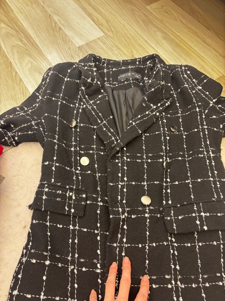 Düğmeli, siyah kareli ceketi. Uzun kollu, normal uzunlukta ve regular fit. Ofis ve günlük kullanıma uygun.