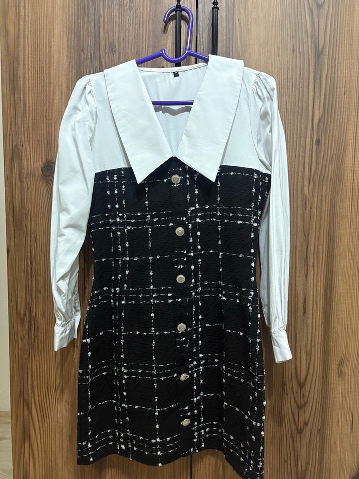 Düğmeli, siyah kareli midi elbise, notched lapel yakalı ve askılı kollu. Sentetik kumaştan, ofis ve gündelik kullanıma uygun. bir kez giyildi hicbir kusuru yoktur