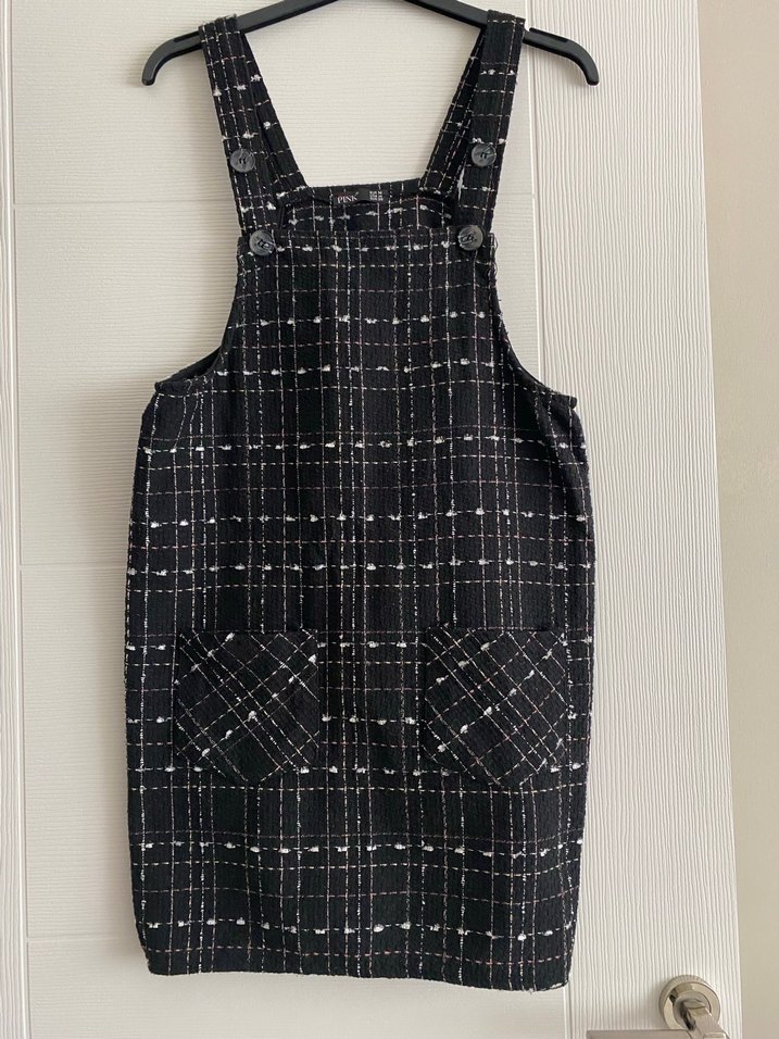 Düğmeli askılı, kruvaze yaka siyah kareli midi tulum, sentetik kumaştan, rahat kesimli. Günlük rahat sokak stiline uygun.