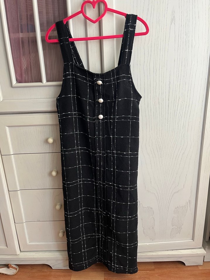 Düğmeli ön kısmı ve kareli deseniyle siyah midi triko elbise. Kolsuz, kesik yaka detaylı, günlük kullanıma uygun rahat kesim.