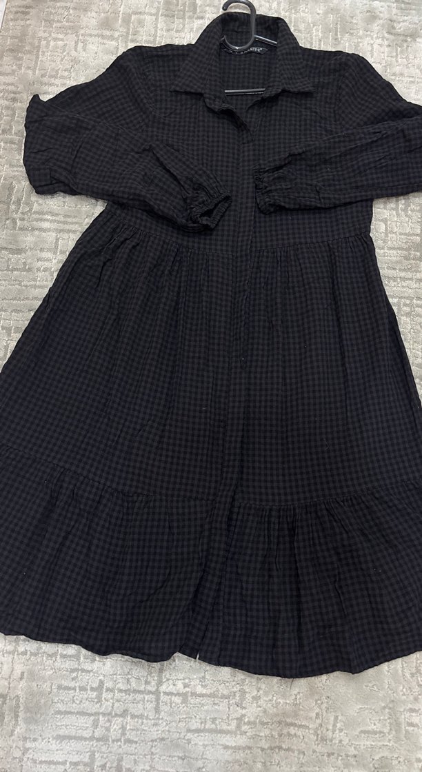 Siyah kareli, keten kumaştan, düğmeli ve uzun kollu, yakalı, bol kesim uzun elbisedir. Günlük kullanıma uygundur.