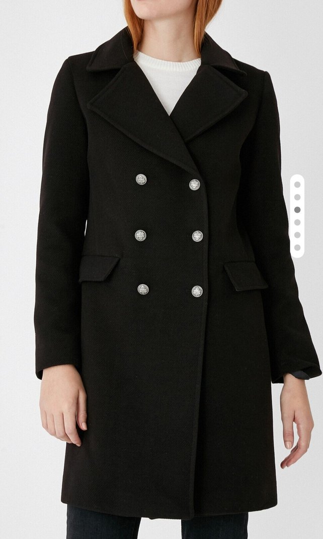 düğmeli ve cepli siyah kaşe kaban, sıcak ve yumuşak kumaştan üretilmiştir. 1 kez giyildi. hicbir sorunu yok.