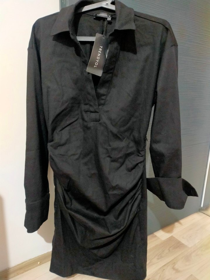 Uzun kollu, düğmeli, keten kumaştan siyah bluz. Ofis kullanımı için uygun, regular fit ve kesik yaka detaylı.