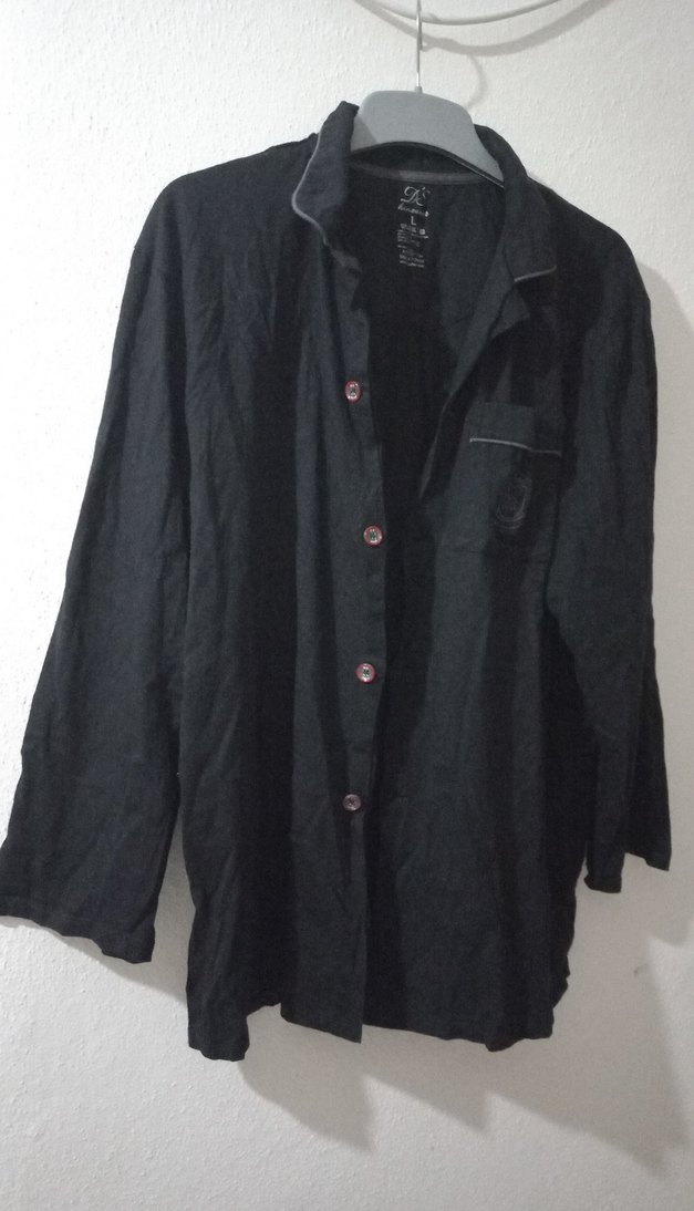 Düğmeli, siyah keten erkek gömlek, kesik yakalı ve uzun kolludur. Rahat kesimi ve normal boyuyla gecelik üst