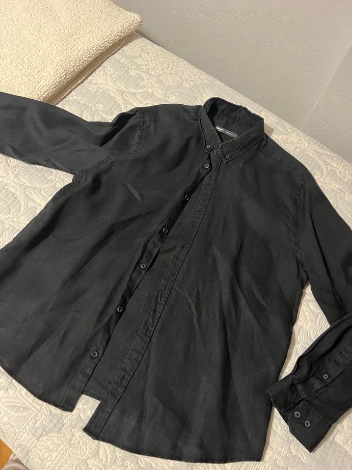 Siyah keten gömlek, yakalı, uzun kollu ve düğmeli tasarıma sahip. Rahat, bol kesimiyle gündelik kullanıma uygun.