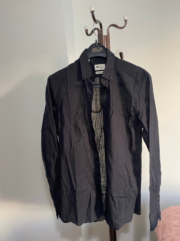 Düğmeli, yakalı ve uzun kollu erkek keten gömlek. Rahat kesimi, siyah rengi ve desensiz yapısıyla ofis ve günlük kullanıma uygundur.