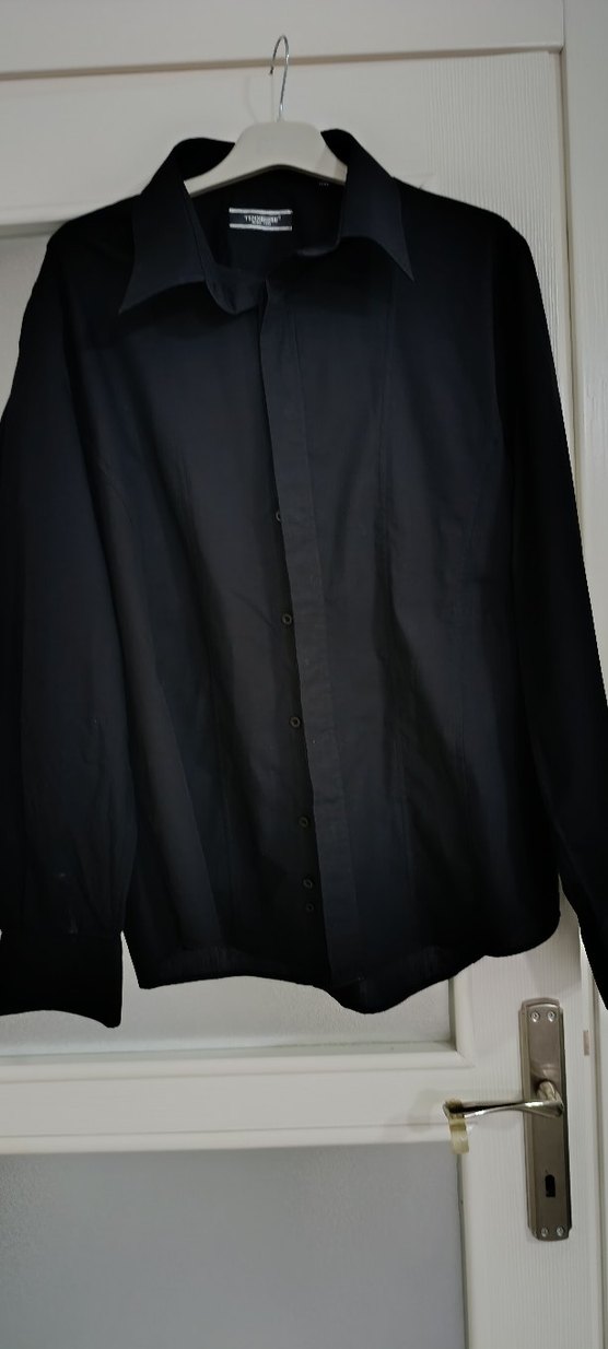 Düğmeli, siyah keten erkek gömlek, kesik yakalı ve uzun kolludur. Ofis ve iş ortamları için uygundur, sade ve temel bir tarza sahiptir.